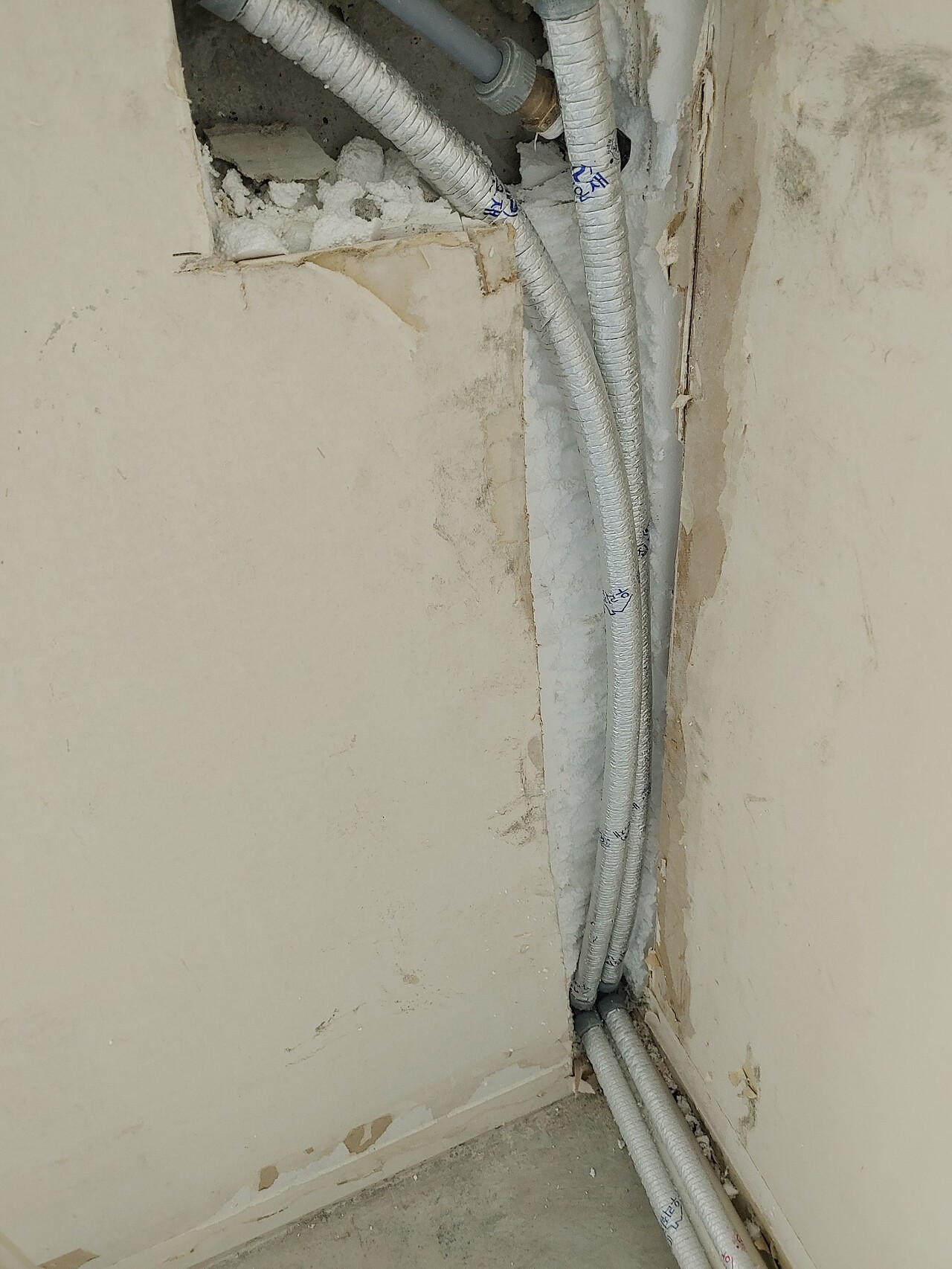 설비 하면서 에어컨 배관도 같이 정리해서 매립했습니다. 거실 확장한 부분 바닥에 묻혀있고 벽에꺼만 보입니다.
