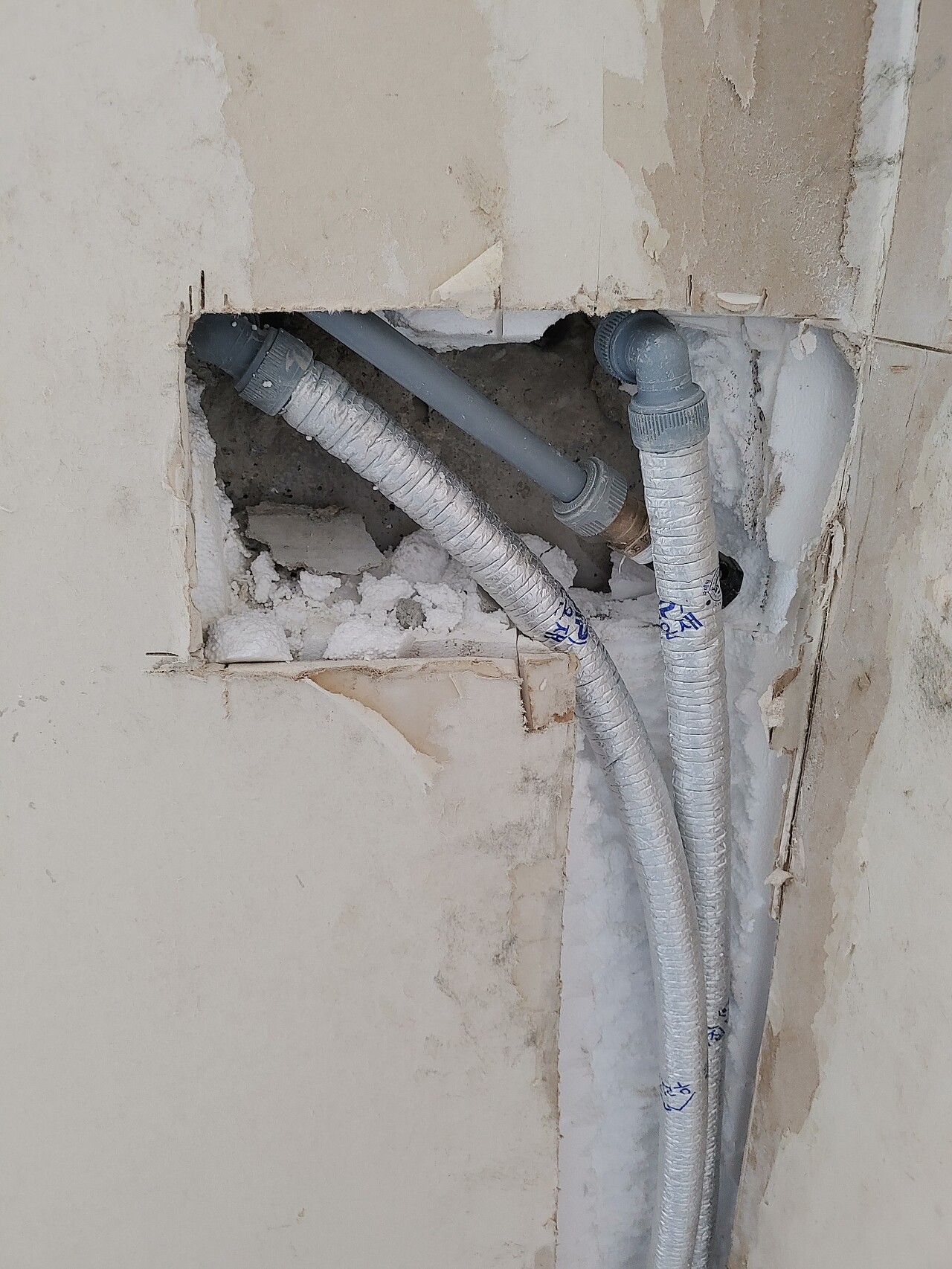 안방 붙박이장 뒷쪽을 지나는 세탁기 배관입니다. 한쪽은 안방쪽 배란다 벽으로, 다른 한쪽은 안방 화장실로 연결되어 있어요. 눈치채셨겠지만, 저희집은 안방쪽 베란다에 세탁기 설치하기로 했거든요. 부엌옆 다용도실을 신랑 서재 공간으로 만들기로 해서요.