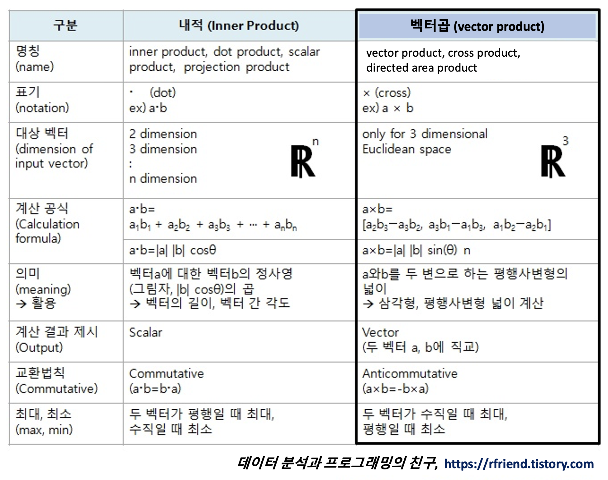 아래에는 내적과 벡터곱(vector product, cross product) 비교한 표입니다. 처음 보면 잘 이해가 안갈 수도 있는데요, 아래의 내용을 한번 쭉 보시고 마지막에 요약 정리할 때 참고하시면 도움이 될 듯 합니다. 큰 차이점 하나만 들자면, 내적(inner product)은 계산 결과로 스칼라(scalar)가 되지만, 벡터곱(vector product)은 계산 결과가 두 벡터 a와 b에 수직이 되는 벡터(vector)가 되고, 외적(outer product)은 행렬(matrix)가 된다는 점입니다.