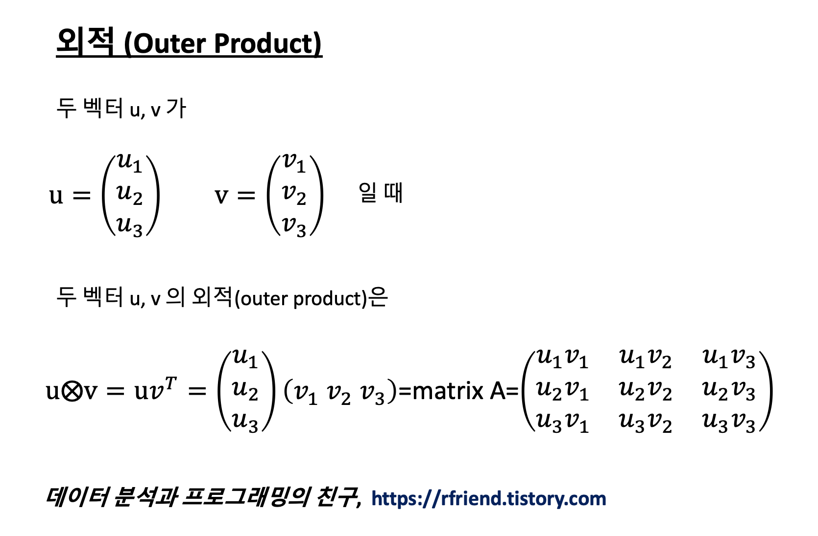 위에서 소개한 두 벡터의 벡터곱(vector product, cross product)의 결과는 벡터인 반면에, 두 벡터의 외적(outer product)의 결과는 행렬입니다. 두 벡터의 외적(outper product)은 아래와 같이 계산합니다.