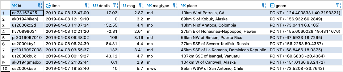 SELECT * FROM data_import.earthquakes_subset_with_geom LIMIT 10; |
