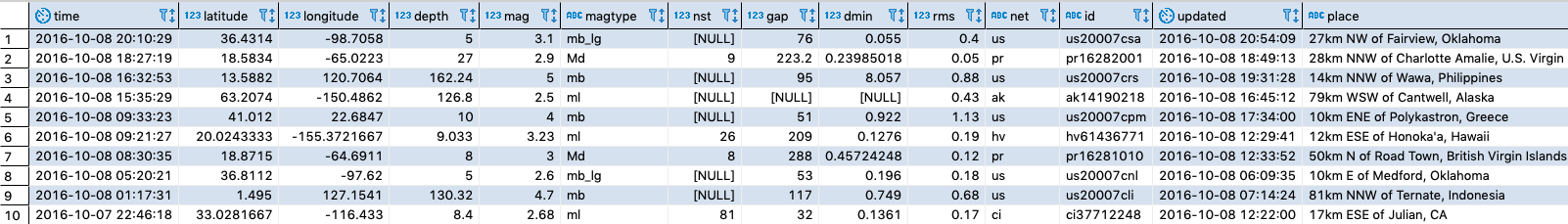 SELECT * FROM data_import.earthquakes_csv LIMIT 10; |