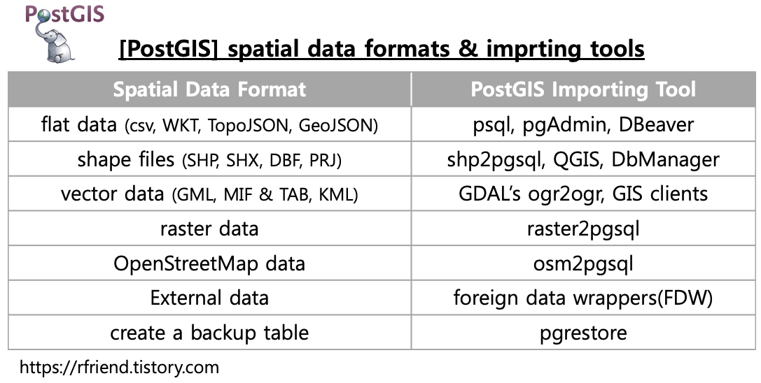 참고로, PostgreSQL, Greenplum DB에 지리공간 데이터를 importing할 수 있는 PostGIS, importing tool들은 아래와 같이 매우 다양합니다.