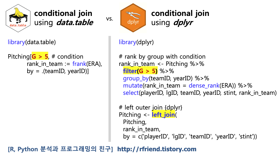 1단계에서 G > 5 라는 조건으로 filter() 를 하여 그룹별로 rank_in_team 을 구해서 별도의 'rank_in_team_df' data.frame을 만든 후에, --> 2단계에서 이를 원본 'Pitching_df'에 left_join() 을 해서 left join 병합을 해주었습니다. G > 5 라는 조건(condition)이 들어감으로써 2단계로 나누어서 진행이 되다보니 코드가 길어졌습니다.