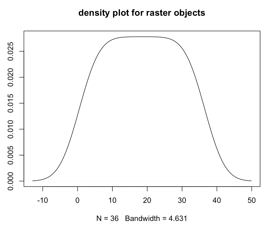 레스터 객체의 픽셀 속성값에 대해서 raster 패키지의 raster::density() 함수를 사용하여 추정 밀도 곡선(smoothed density estimates curve) 을 그릴 수 있습니다.