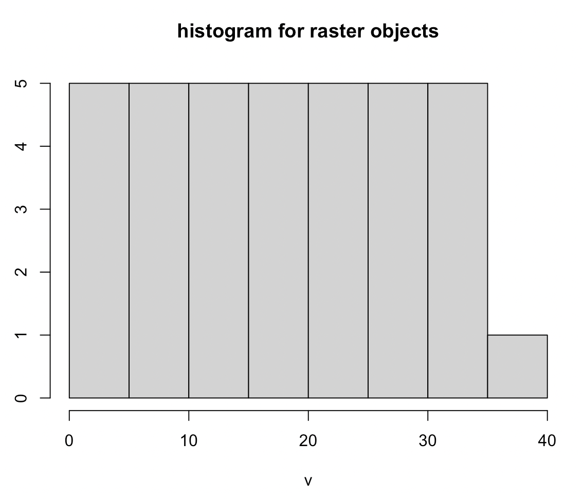 레스터 객체의 픽셀 속성값에 대해 히스토그램(histogram for raster objects)을 그리려면 hist() 함수를 사용하면 됩니다.