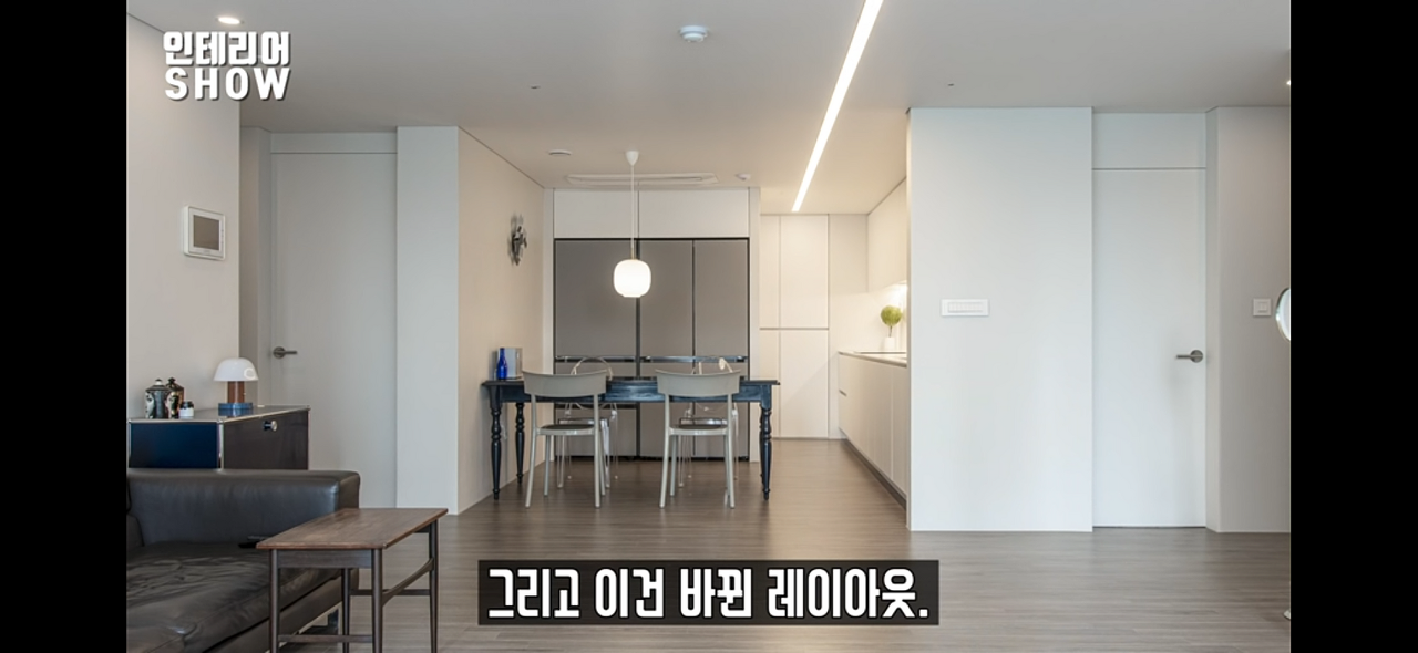 재밌는건 아일랜드 식탁 좌측 벽면에 4개 문이달린 가짜 장을 만들거래요. ㅎㅎ 그냥 벽이 수납장처럼 보이게.. 그중 하나의 문은 열려서 라인조명 분배기랑 뭔가를 넣어둔다고 하네요. 듣고나니... 위 부엌 냉장고 뒷쪽 오른쪽에 조금 보이는 저 긴 장도 가짜가 아닌가~ 하는 생각이 들었어요.