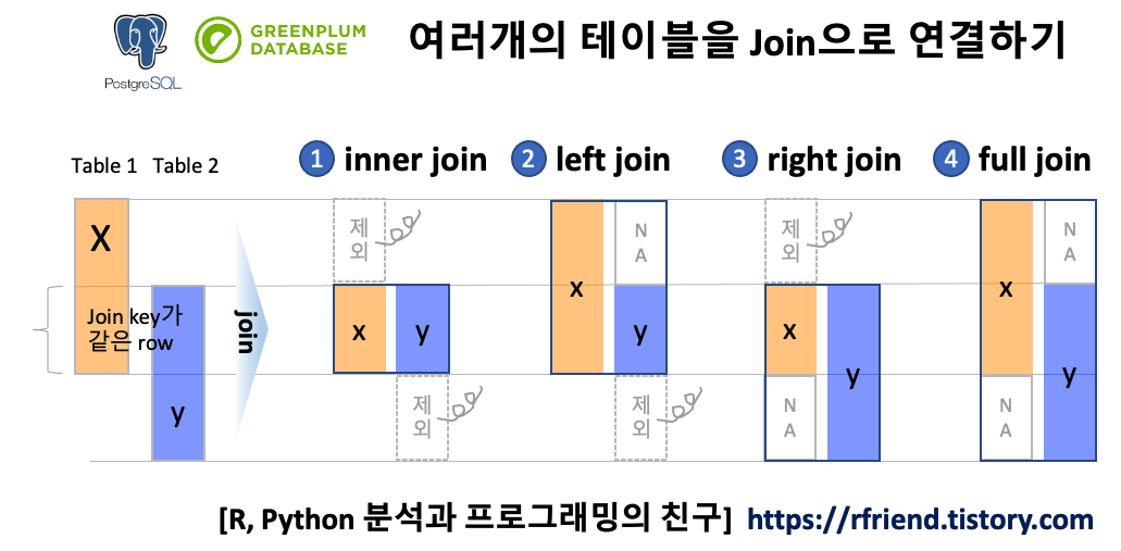 Greenplum and PostgreSQL Database 2021. 5. 30. 21:47이번 포스팅에서는 PostgreSQL, Greenplum Database에서 여러개의 테이블을 Key 값을 기준으로 JOIN 구문을 사용하여 연결하는 다양한 방법을 소개하겠습니다. 그리고 두 테이블 내 관측치 간의 모든 가능한 조합을 반환해주는 CROSS JOIN 에 대해서도 마지막에 소개하겠습니다. (DB 종류에 상관없이 join SQL query는 거의 비슷합니다.)