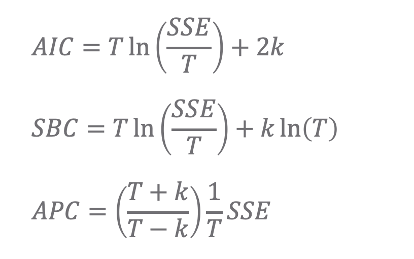위의 AIC, SBC, APC 지표들도 SSE(Error Sum of Square) 에 기반한 지표들로서, 값이 작을 수록 더 잘 적합된 모델을 의미합니다. 이들 지표 역시 SSE 를 기본으로 해서 여기에 모델에서 사용한 모수의 개수(k, 패널티로 사용됨), 관측치의 개수(T, 관측치가 많을 수록 리워드로 사용됨)를 추가하여 조금씩 변형을 한 통계량들입니다.