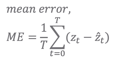 ME(Mean Error) 는 MAE(Mean Absolute Error)와 함께 해석하는 것이 필요합니다. 왜냐하면 큰 오차 값들이 존재한다고 하더라도 ME 값만 볼 경우 + 와 - 값이 서로 상쇄되어 매우 작은 값이 나올 수도 있기 때문입니다. 따라서 MAE 값을 통해 실제값과 예측값 간에 오차가 평균적으로 얼마나 큰지를 확인하고, ME 값의 부호를 통해 평균적으로 과다예측(부호가 '+'인 경우) 혹은 과소예측(부호가 '-'인 경우) 인지를 가늠해 볼 수 있습니다.