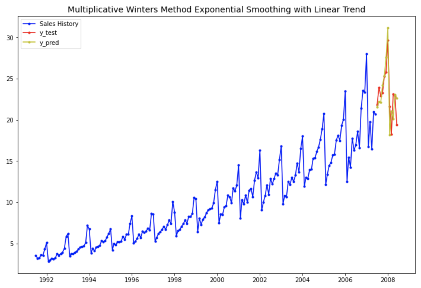 그럼, 실제로 다양한 지수평활법으로 위의 약 판매량 시계열 데이터에 대한 예측 모델을 만들어 예측을 해보고, 다양한 평가지표로 모델 간 비교를 해봐서 가장 우수한 모델이 무엇인지, 과연 앞서 말한 "Multiplicative Winters' method with Linear Trend" 모델이 가장 우수할 것인지 확인해보겠습니다. 보는게 믿는거 아니겠습니까!