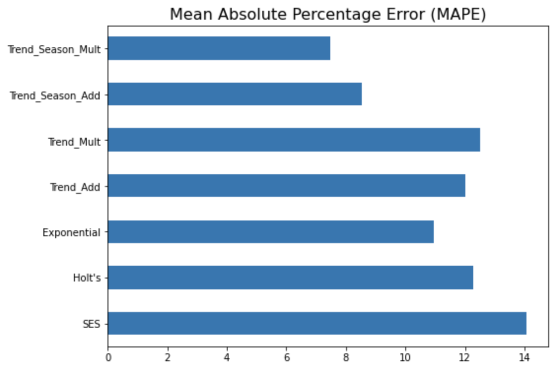 MAPE (Mean Absolute Percentage Error) 지표에 대해서만 옆으로 누운 막대그래프로 모델 간 성능을 비교해서 시각화를 해보면 아래와 같습니다. (MAPE 값이 작을수록 상대적으로 더 우수한 모델로 해석함.)