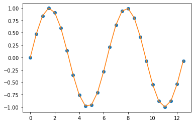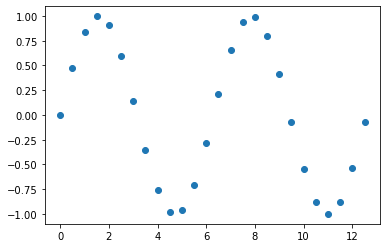 먼저 '0.5'로 동일한 간격을 가지는 x 값들에 대한 사인 함수 (sine function) 의 y값을 계산해서 예제 데이터로 사용하겠습니다. 아래 예졔의 점과 점 사이의 값들이 비어있는 결측값이라고 간주하고, 이들 값을 채워보겠습니다.
