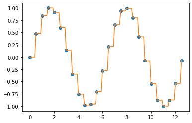 plt.plot(x, y, "o", xnew, y_new_nearest)