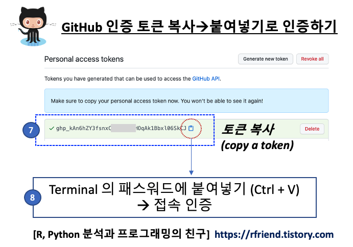 (1) 프로필 메뉴 (우측 상단) > (2) Settings > (3) Developer settings > (4) Personal access tokens > (5) Generate new token > (6) New personal access token 설정 (Note, Expiration, Select scopes) 후 Generate token 클릭 > (7) 새로 생성된 token 을 복사(Ctrl + C) --> 터미널에서 붙여넣기 (Ctrl + V)