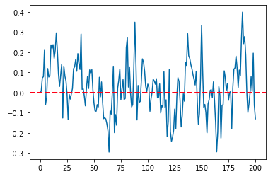 plt.axhline(0, 0, 200, color='red', linestyle='--', linewidth=2)