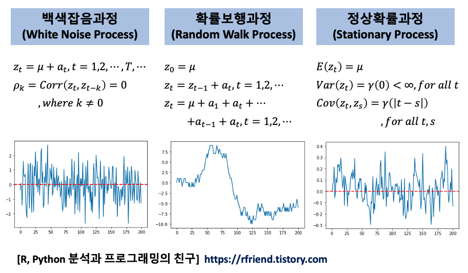 [ 백색잡음과정(white noise) vs. 확률보행과정 (random walk) vs. 정상확률과정 (stationary process) ]