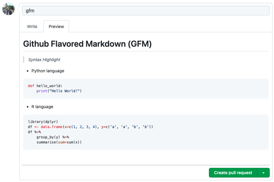 GFM 으로 'Write'메뉴의 본문에서 Syntax Highlight 를 해서 문서를 작성했다면, 상단의 'Preview' 메뉴에서 미리보기를 하여 확인해볼 수 있습니다. 아래에 보니 Python과 R 언어의 Syntax Highlight 가 잘 되었음을 확인할 수 있네요.