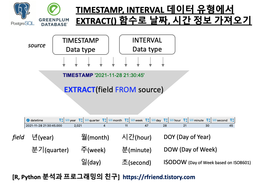 [PostgreSQL, Greenplum] EXTRACT() 함수로 TIMESTAMP, INTERVAL 데이터 유형에서 날짜, 시간 정보 가져오기