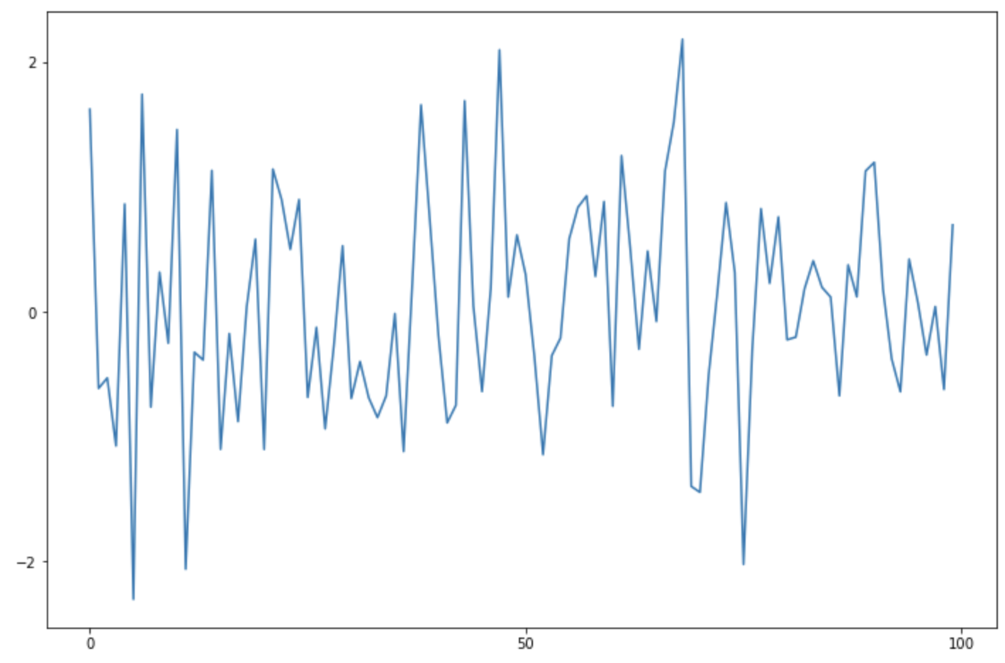 먼저, numpy 모듈을 사용해서 표준정규분포 X~N(0, 1) 로부터 난수 100개를 생성해서 matplotlib의 기본 설정으로 선 그래프를 그려보겠습니다. matplotlib의 Figure 객체를 만들고, fig.add_subplot(1, 1, 1) 로 하위 플롯을 하나 만든 다음에 선 그래프를 그렸습니다.
