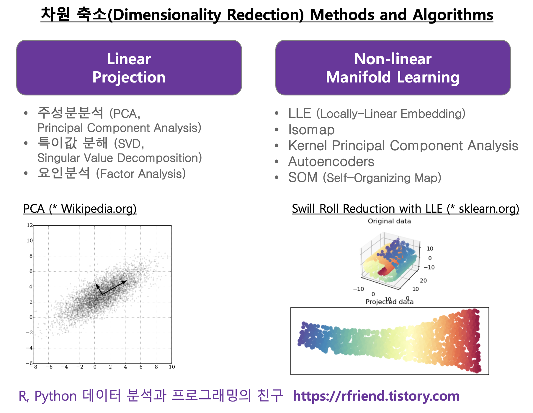 다음번 포스팅에서는 linear projection 방법 중에서 Python 의 Sklearn 모듈을 활용하여 주성분분석 (PCA, Principal Component Analysis)을 하는 방법을 소개하겠습니다.