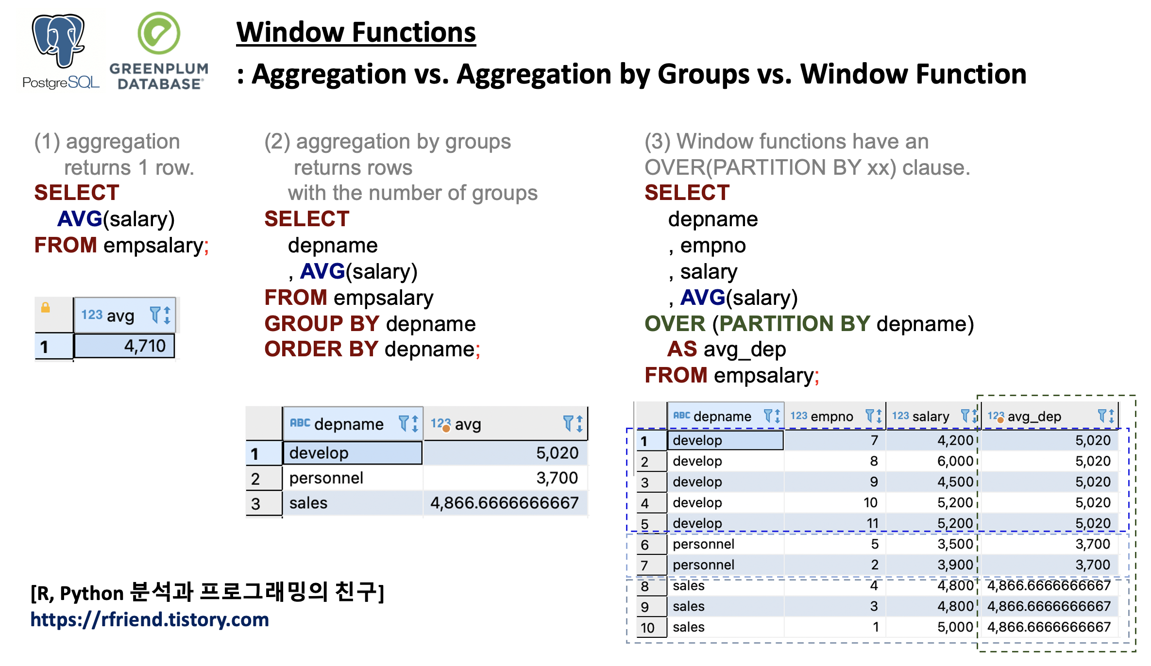 아래는 (a) AVG() 로 전체 급여의 전체 평균 집계, (b) AVG() GROUP BY depname 로 부서 그룹별 평균 집계, (c) AVG() OVER (PARTITION BY depname) 의 Window Function을 사용해서 부서 집합 별 평균을 계산해서 직원번호 ID의 행별로 결과를 반환하는 것을 비교해 본 것입니다. 반환하는 행의 개수, 결과를 유심히 비교해보시면 aggregate function 과 window function 의 차이를 이해하는데 도움이 될거예요.