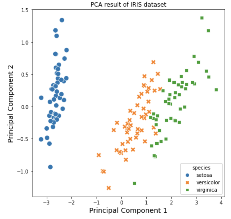 이제 주성분 개수를 2개로 지정(n_components=2)해서 주성분 분석을 실행해보겠습니다. Python의 sklearn 모듈의 decomposition.PCA 메소드를 사용하겠습니다.