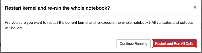 아래와 같은 팝업 창이 뜨면 "Restart and Run All Cells" 메뉴를 선택해서 클릭해주면 됩니다.