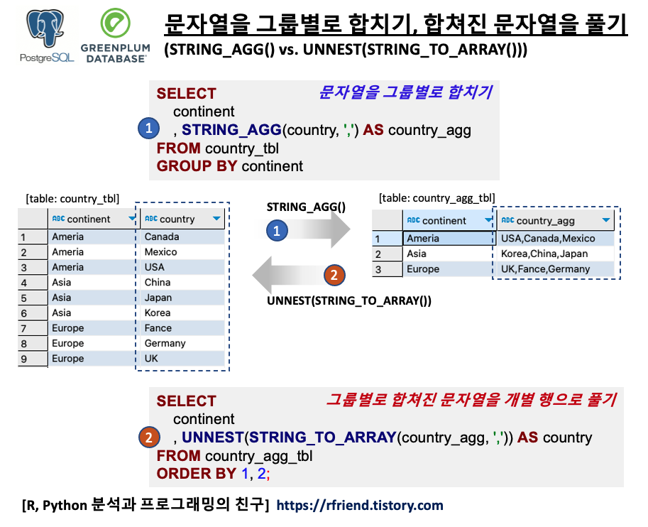 [PostgreSQL, Greenplum] 개별 문자열을 하나의 문자열로 합치기, 문자열을 Array로 만들기, 문자열 Array를 나누어서 개별 문자열 행으로 풀기