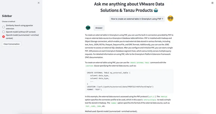 이 질문에 대한 대답은 제품 설명서를 검색 가능하게 만들고 작업별 프롬프트를 OpenAI에 제공하면 결과가 더 신뢰할 수 있다는 것입니다. 즉, 사용자가 질문할 때 Greenplum 테이블에서 적합한 데이터 세트를 검색하도록 pgvector에게 요청합니다. 그런 다음 사용자의 질문에 답변하기 위한 참조 문서(reference document)로 OpenAI에 제공합니다.