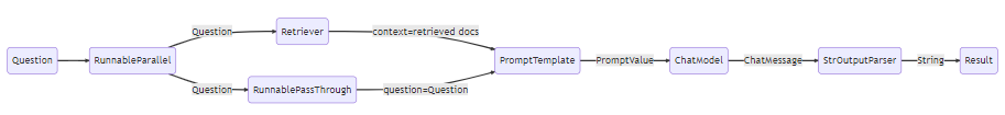 1. 첫 번째 단계에서는 두 개의 항목이 있는 RunnableParallel 객체를 생성합니다. 첫 번째 항목인 context는 검색기에 의해 가져온 문서 결과를 포함할 것입니다. 두 번째 항목인 question은 사용자의 원래 질문을 담을 것입니다. 질문을 전달하기 위해 RunnablePassthrough를 사용하여 이 항목을 복사합니다.
