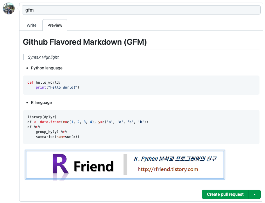 (3) 비교한 변경사항이 원하는 내용임을 확인하였으면 Pull request의 제목과 설명을 추가한 후에 ‘Create pull request’ 단추를 누릅니다.