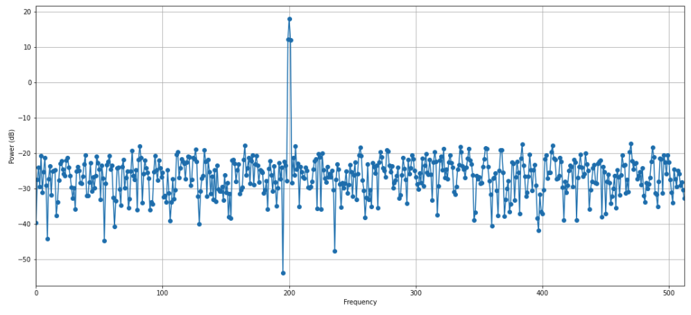 우리가 위에서 data_cosine(N=1024, A=0.1, sampling=1024, freq=200) 메소드를 사용해서 200 Hz 의 데이터를 생성하였기 때문에, 이 샘플 데이터로부터 주파수를 분해하면 200 Hz 가 되어야 할텐데요, 스펙트럼 분석 결과도 역시 200 Hz 에서 스파이크가 엄청 높게 튀는군요.