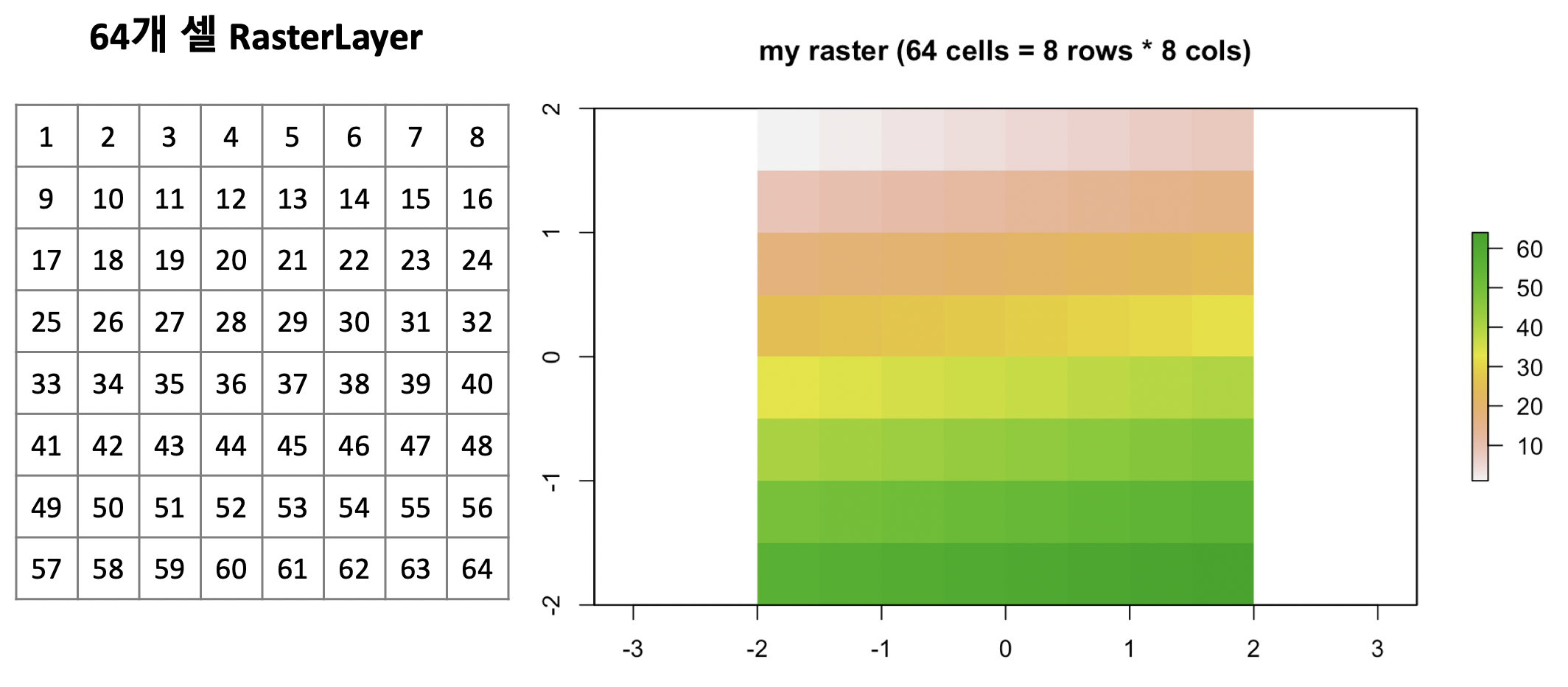 아래의 예는 8개의 행과 8개의 열을 가진, 총 64 개의 셀(or 픽셀)을 가진 RasterLayer 클래스를 직접 만들어본 것입니다. 이때 레스터 객체의 좌표 참조 시스템(CRS, Coordinates Reference System)은 WGS84 가 기본 설정값이며, 이는 해상도(resolution)의 단위가 도 (in degrees) 라는 의미입니다. 아래 예에서는 res = 0.5 로서 해상도를 0.5도로 설정해주었습니다. 각 셀의 값은 왼쪽 상단부터 시작하여, 행 방향(row-wise)으로 왼쪽에서 오른쪽으로 채워나가게 됩니다. 아래 예는 총 64개 셀의 각 셀의 값을 1~64 의 정수값을 좌측 상단에서 시작하여 우측으로 한 줄씩 채워나가도록 했으며, 제일 아래에 8*8 셀들의 값과 오른쪽에 plot()으로 시각화한 결과를 확인해보시기 바랍니다.