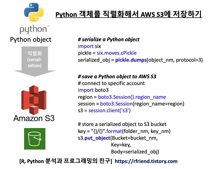 파이썬의 Pickle 방식으로 직렬화할 수 있는 객체는 모든 파이썬 객체를 망라합니다. (정수, 실수, 복소소, 문자열, 블리언, 바이트 객체, 바이트 배열, None, 리스트, 튜플, 사전, 집합, 함수, 클래스, 인스턴스 등)