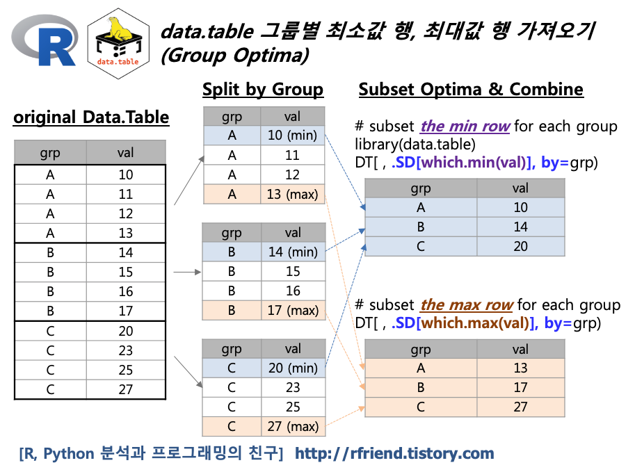 지난번 포스팅에서는 R data.table에서 .SD[]와 by를 사용해서 그룹별로 부분집합 가져오기 (Group Subsetting) 하는 방법을 소개하였습니다. (rfriend.tistory.com/611)