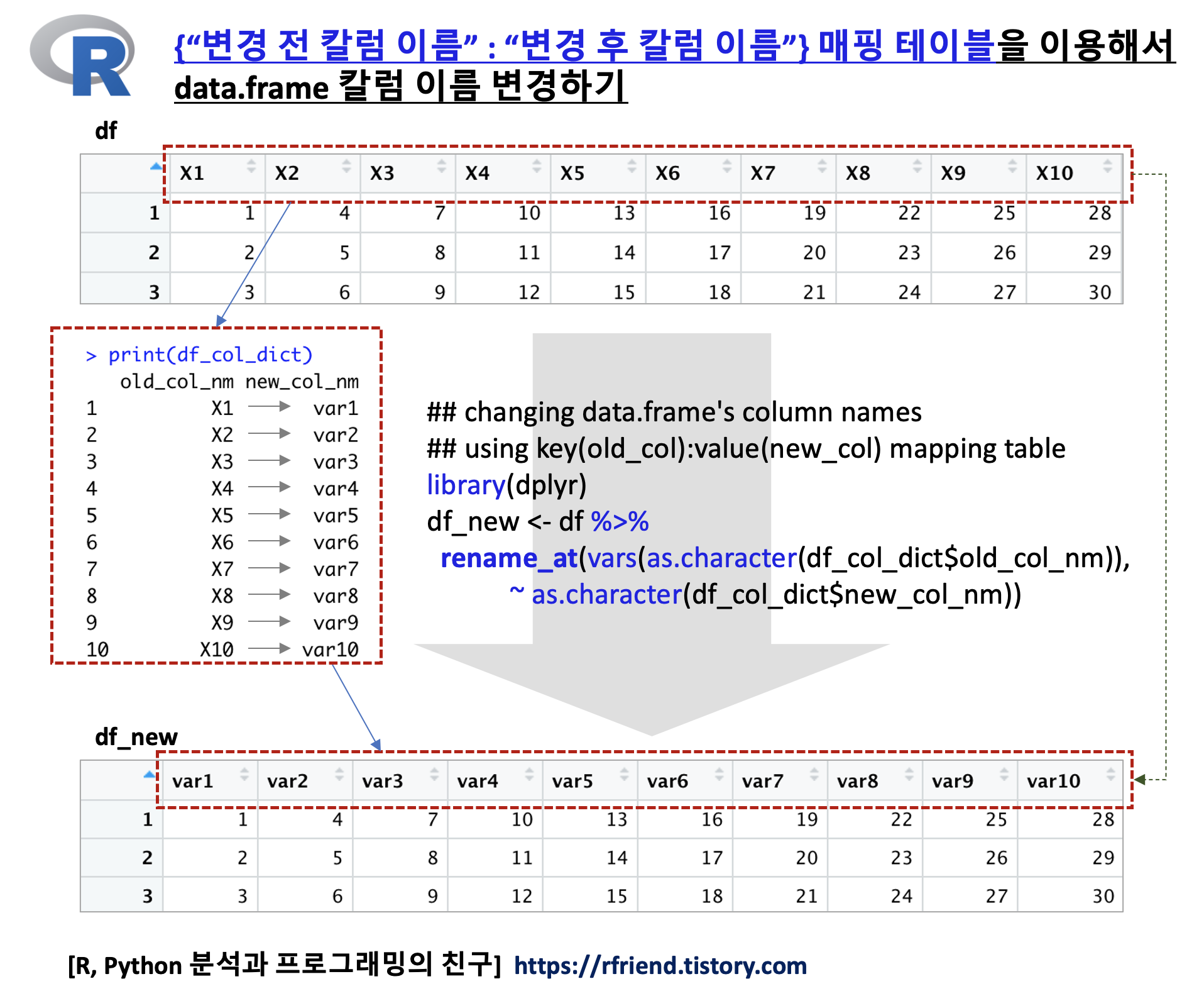 다음으로, '변경 전 칼럼 이름 : 변경 후 칼럼 이름' 매핑 테이블을 만들어보겠습니다. 아래 예제에서는 변경 전 칼럼 이름 "X1"~"X10" 을 --> 변경 후 칼럼 이름 "var1"~"var10" 의 매핑 테이블 data.frame을 만들었습니다. (특정 칼럼만 선별적으로 변경하고 싶으면 해당 칼럼의 "변경 전 : 변경 후 매핑 테이블"을 만들면 됩니다.)