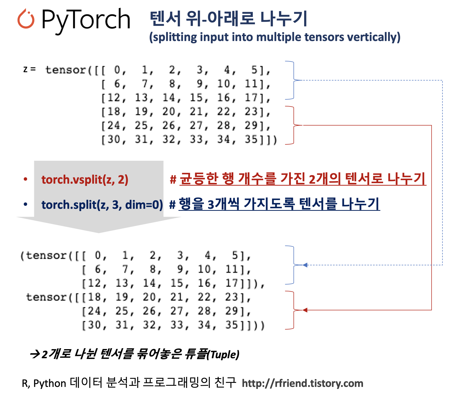먼저 PyTorch 텐서를 위-아래의 수직으로 복수 개의 텐서로 나누기를 해보겠습니다.